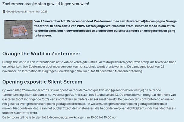Zoetermeer oranje: stop geweld tegen vrouwen! Gepubliceerd: 21 november 2025 Van 25 november tot 10 december doet Zoetermeer mee aan de wereldwijde campagne Orange the World. In deze editie van 2025 zetten jonge vrouwen hun stem, kunst en moed in om stilte te...