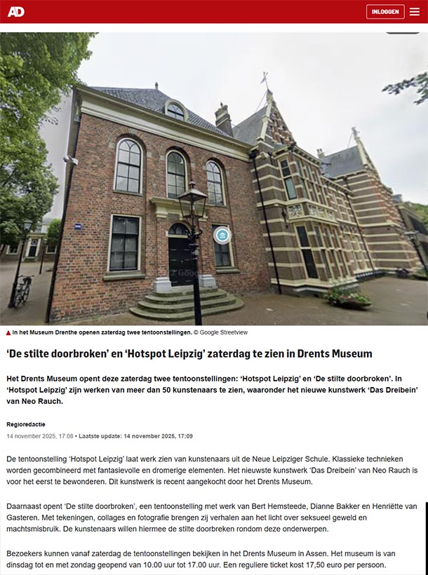 Een tentoonstelling met werk van Bert Hemsteede, Dianne Bakker en Henriëtte van Gasteren. Opening 18 november. Met tekeningen, collages en fotografie brengen zij verhalen aan het licht over seksueel geweld en machtsmisbruik. De kunstenaars willen hiermee de stilte doorbreken rondom deze onderwerpen.